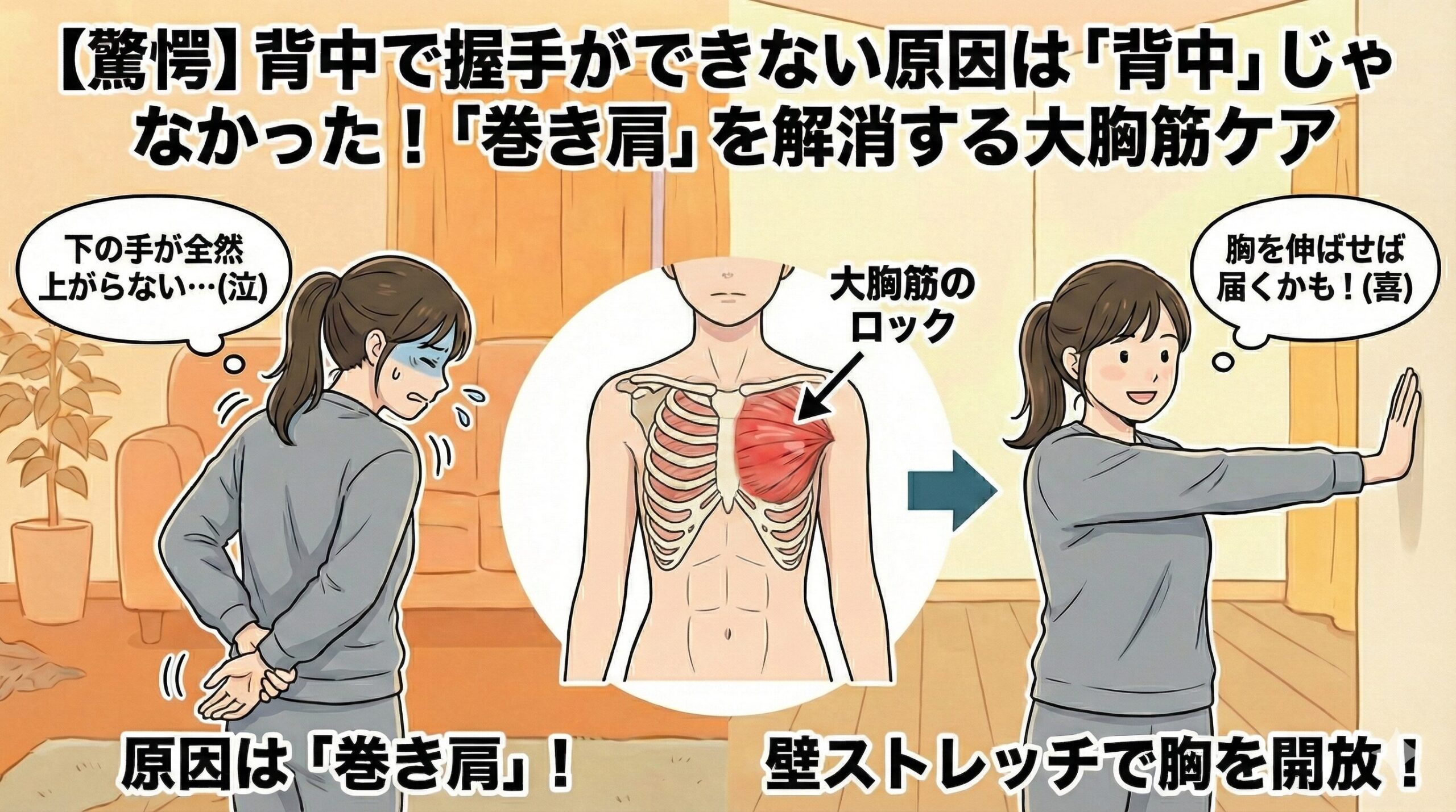 背中で握手をする時、下の手は「腕を内側にねじって、後ろに引く」という複雑な動きをします。 しかし、胸の筋肉(大胸筋)が硬くなって肩が前に出ている(巻き肩)状態だと、この動きが完全にロックされてしまうのです。
